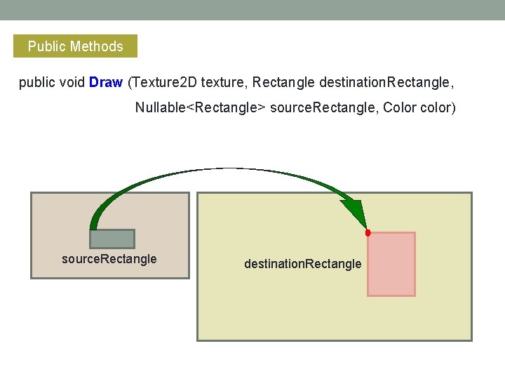 Public Methods public void Draw (Texture 2 D texture, Rectangle destination. Rectangle, Nullable<Rectangle> source. Rectangle, Color color) source. Rectangle destination. Rectangle