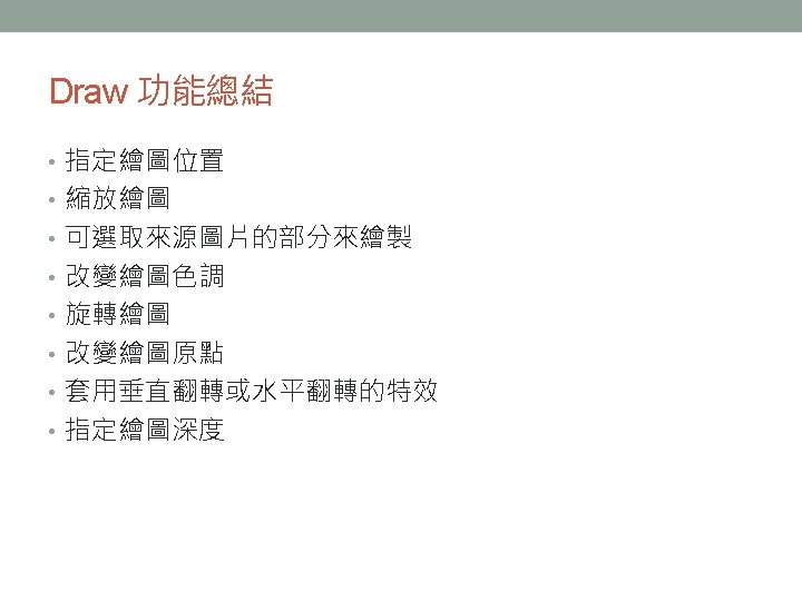 Public Methods public void Draw (Texture 2 D texture, Rectangle destination. Rectangle, Nullable<Rectangle> source. Rectangle, Color color, float rotation, Vector 2 origin, Sprite. Effects effects, float layer. Depth) destination. Rectangle 提供繪圖位置與縮放比例的資訊