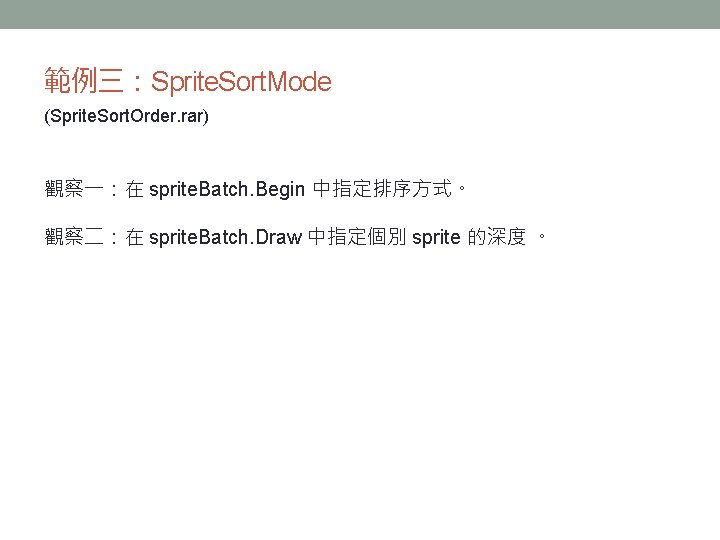 範例三:Sprite. Sort. Mode (Sprite. Sort. Order. rar) 觀察一:在 sprite. Batch. Begin 中指定排序方式。 觀察二:在 sprite. Batch. Draw 中指定個別 sprite 的深度 。