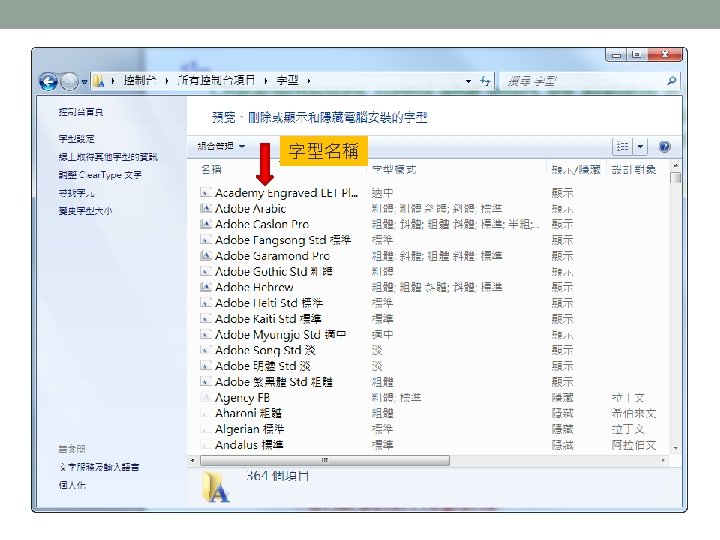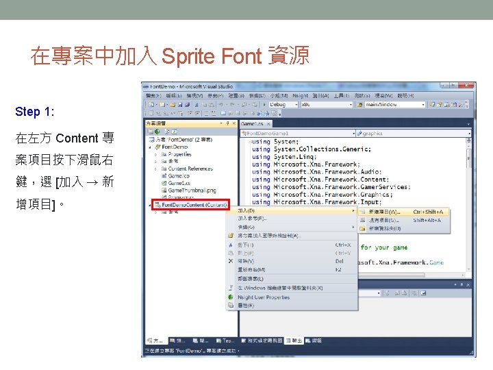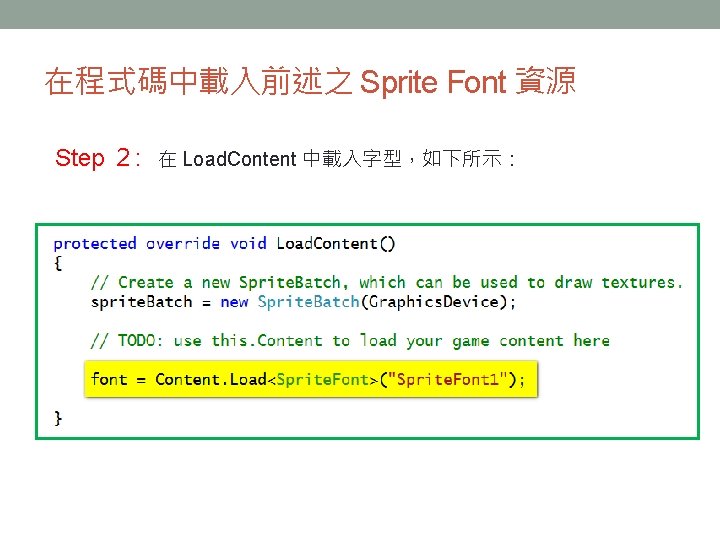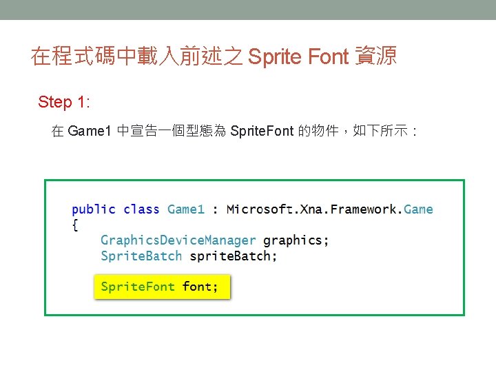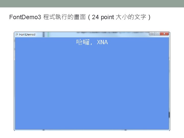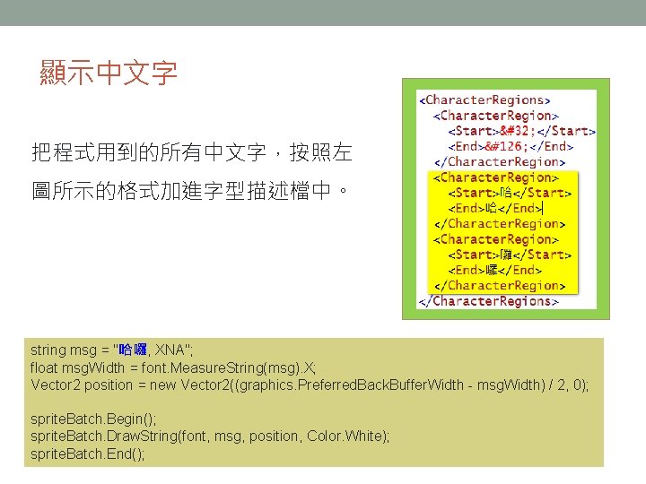 顯示中文字 把程式用到的所有中文字,按照左 圖所示的格式加進字型描述檔中。 string msg = "哈囉, XNA"; float msg. Width = font. Measure. String(msg). X; Vector 2 position = new Vector 2((graphics. Preferred. Back. Buffer. Width - msg. Width) / 2, 0); sprite. Batch. Begin(); sprite. Batch. Draw. String(font, msg, position, Color. White); sprite. Batch. End();