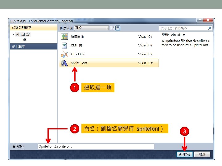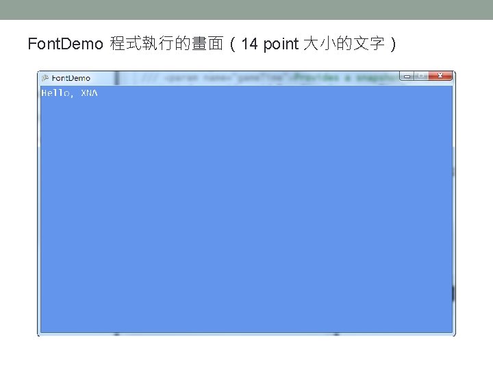 . spritefont 檔案格式解說 • XML 格式的文字檔。 • <Font. Name>Segoe UI Mono</Font. Name> 字型名稱 • <Size>14</Size> 文字大小(單位為 point) • <Style>Regular</Style> 文字樣式:Regular, Bold, Italic(標準、粗體、斜體)
