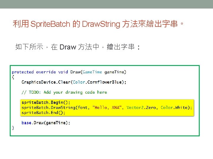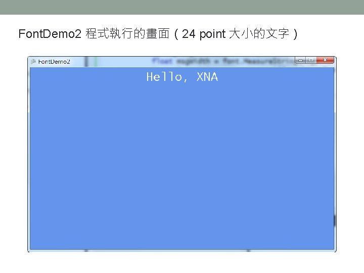 利用 Sprite. Font. Measure. String 來計算字串的寬與高 public Vector 2 Measure. String (string text) • 參數 text 是欲測量寬與高的字串。 • 傳回值為 Vector 2 型態,其中 X 為寬度,Y 為 高度,單位都是像素。 範例 Vector 2 size = font. Measure. String(“Hello, XNA”); // size. X 是寬度 // size. Y 是高度
