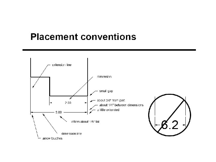 Dimension lines are thinner than object lines They are drawn at right angles to the distance dimensioned There should be a visible gap between the object and the Extension line. Avoid crossing dimension lines. Place dimension off the object and group them when possible