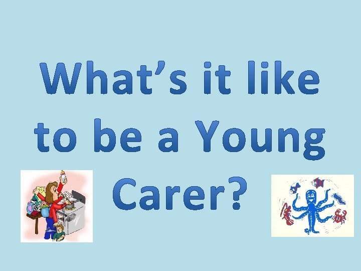 Reasons it is sometimes hard to be a Young Carer… • Have to be grown up • Don’t get to play with friends much • Friends can’t come for tea or have sleepovers • Feeling angry and like it is not fair • Feeling anxious and worried lots of the time • Feeling guilty and like you have too much to cope • Struggle to get homework with done
