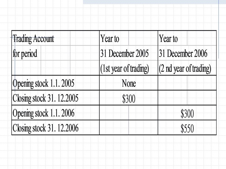 2005 Jan 1 Bal b/d Stock $ 2005 X Jan 1 Trading a/c $ X Trading and profit and loss account for the year ended 31 Dec 2005 Opening stock Purchase $ X Sales X $ X
