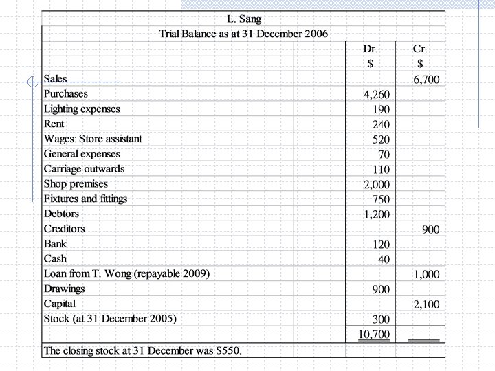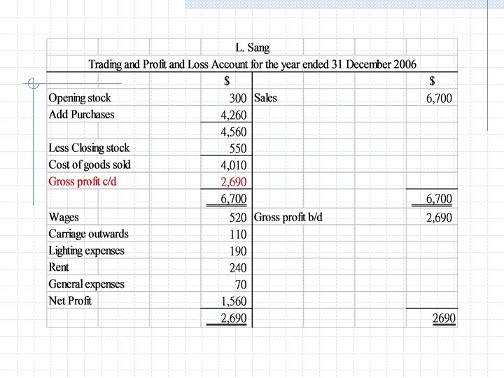 2005 Dec 31 Trading a/c Stock $ 300 L. Sang Trading and Profit and loss account for the year ended 31 Dec 2005 $ Purchases 2900 Less: Closing stock 300 Cost of goods sold 2600 Gross profit c/d 1250 3850 Sales Closing stock $ 3850 300 3850