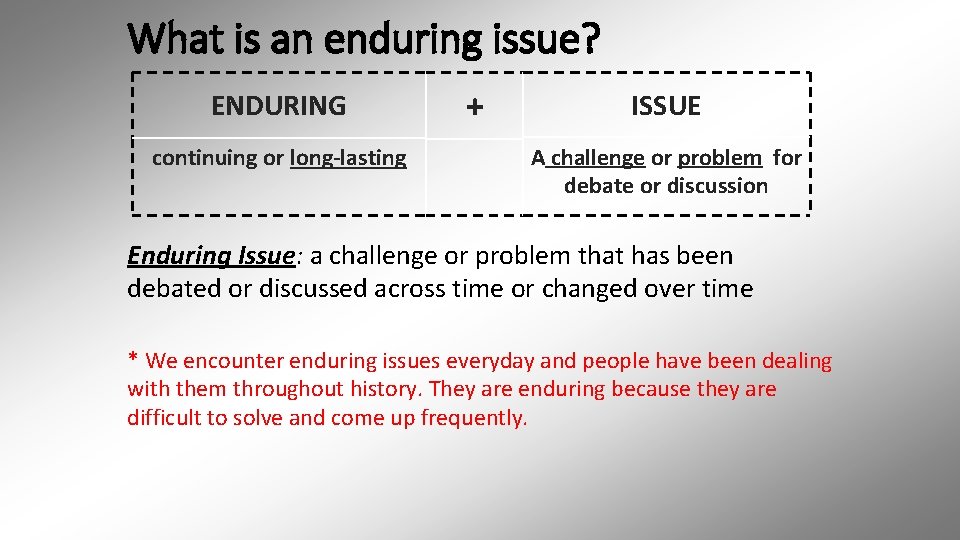 What is an enduring issue? ENDURING continuing or long-lasting + ISSUE A challenge or problem for debate or discussion Enduring Issue: a challenge or problem that has been debated or discussed across time or changed over time * We encounter enduring issues everyday and people have been dealing with them throughout history. They are enduring because they are difficult to solve and come up frequently.