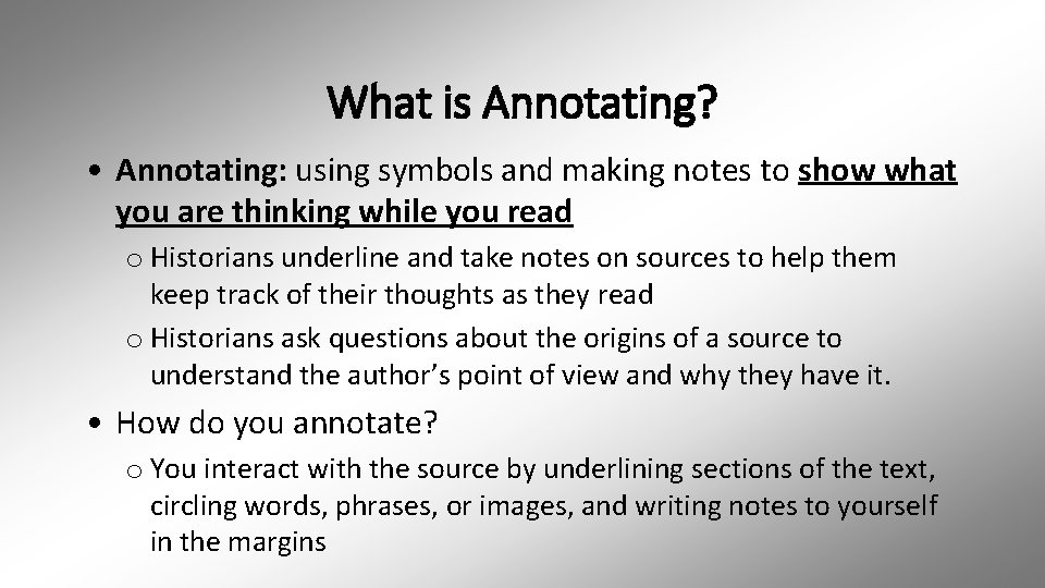 What is Annotating? • Annotating: using symbols and making notes to show what you are thinking while you read o Historians underline and take notes on sources to help them keep track of their thoughts as they read o Historians ask questions about the origins of a source to understand the author’s point of view and why they have it. • How do you annotate? o You interact with the source by underlining sections of the text, circling words, phrases, or images, and writing notes to yourself in the margins
