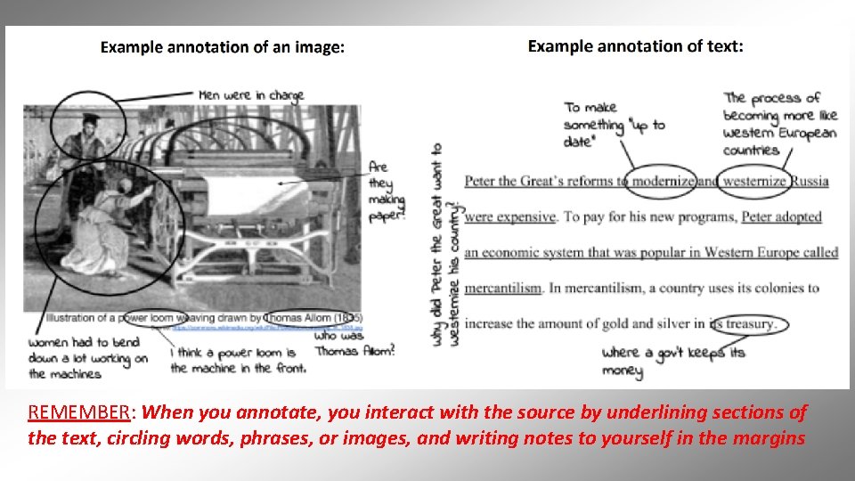 REMEMBER: When you annotate, you interact with the source by underlining sections of the text, circling words, phrases, or images, and writing notes to yourself in the margins