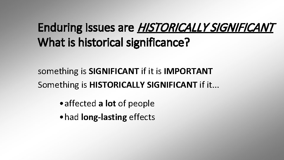 Enduring Issues are HISTORICALLY SIGNIFICANT What is historical significance? something is SIGNIFICANT if it is IMPORTANT Something is HISTORICALLY SIGNIFICANT if it. . . • affected a lot of people • had long-lasting effects
