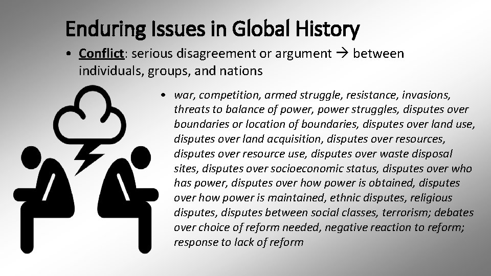 Enduring Issues in Global History • Conflict: serious disagreement or argument between individuals, groups, and nations • war, competition, armed struggle, resistance, invasions, threats to balance of power, power struggles, disputes over boundaries or location of boundaries, disputes over land use, disputes over land acquisition, disputes over resources, disputes over resource use, disputes over waste disposal sites, disputes over socioeconomic status, disputes over who has power, disputes over how power is obtained, disputes over how power is maintained, ethnic disputes, religious disputes, disputes between social classes, terrorism; debates over choice of reform needed, negative reaction to reform; response to lack of reform