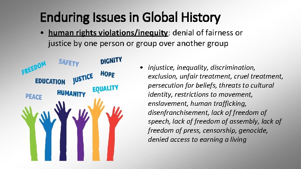 Enduring Issues in Global History • human rights violations/inequity: denial of fairness or justice by one person or group over another group • injustice, inequality, discrimination, exclusion, unfair treatment, cruel treatment, persecution for beliefs, threats to cultural identity, restrictions to movement, enslavement, human trafficking, disenfranchisement, lack of freedom of speech, lack of freedom of assembly, lack of freedom of press, censorship, genocide, denied access to earning a living