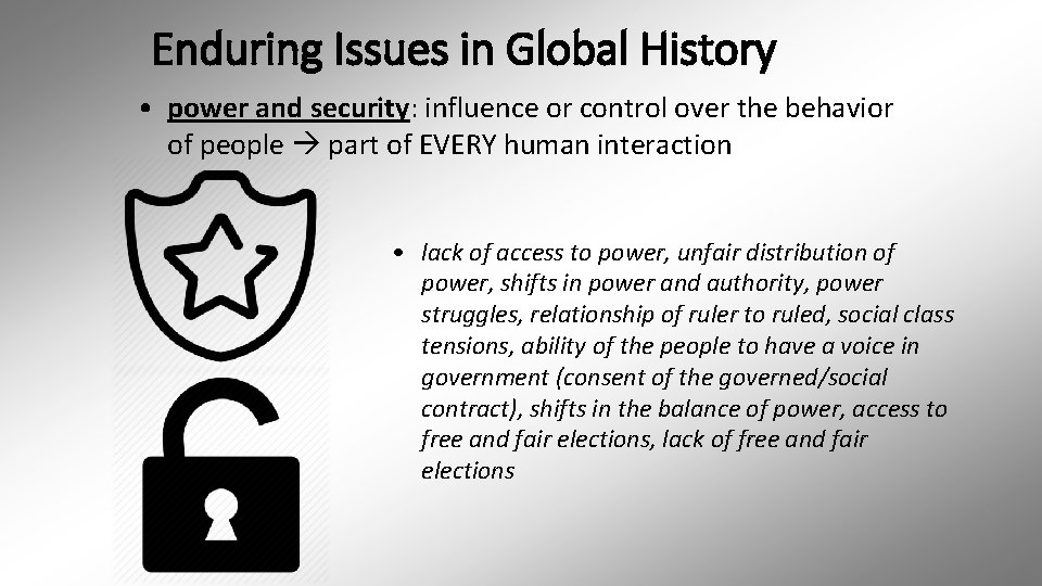 Enduring Issues in Global History • power and security: influence or control over the behavior of people part of EVERY human interaction • lack of access to power, unfair distribution of power, shifts in power and authority, power struggles, relationship of ruler to ruled, social class tensions, ability of the people to have a voice in government (consent of the governed/social contract), shifts in the balance of power, access to free and fair elections, lack of free and fair elections