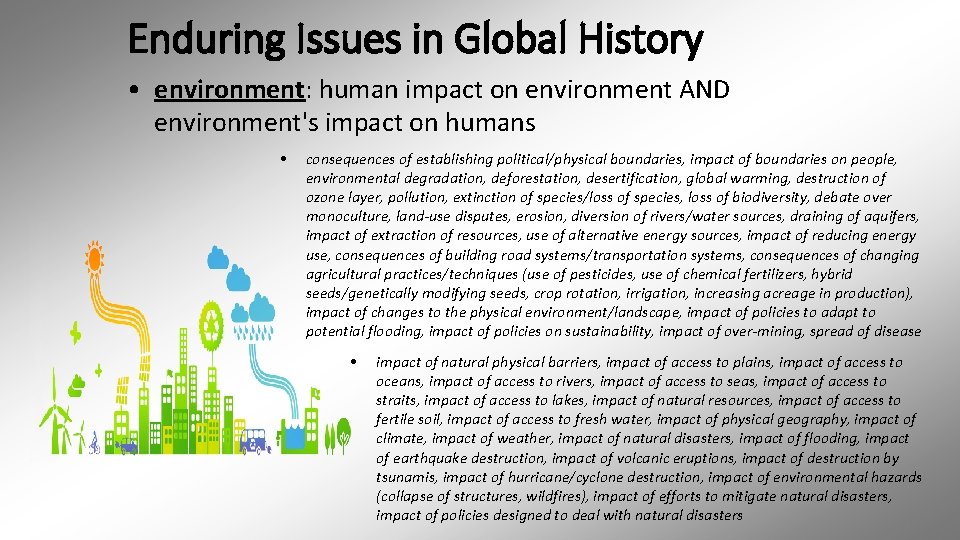 Enduring Issues in Global History • environment: human impact on environment AND environment's impact on humans • consequences of establishing political/physical boundaries, impact of boundaries on people, environmental degradation, deforestation, desertification, global warming, destruction of ozone layer, pollution, extinction of species/loss of species, loss of biodiversity, debate over monoculture, land-use disputes, erosion, diversion of rivers/water sources, draining of aquifers, impact of extraction of resources, use of alternative energy sources, impact of reducing energy use, consequences of building road systems/transportation systems, consequences of changing agricultural practices/techniques (use of pesticides, use of chemical fertilizers, hybrid seeds/genetically modifying seeds, crop rotation, irrigation, increasing acreage in production), impact of changes to the physical environment/landscape, impact of policies to adapt to potential flooding, impact of policies on sustainability, impact of over-mining, spread of disease • impact of natural physical barriers, impact of access to plains, impact of access to oceans, impact of access to rivers, impact of access to seas, impact of access to straits, impact of access to lakes, impact of natural resources, impact of access to fertile soil, impact of access to fresh water, impact of physical geography, impact of climate, impact of weather, impact of natural disasters, impact of flooding, impact of earthquake destruction, impact of volcanic eruptions, impact of destruction by tsunamis, impact of hurricane/cyclone destruction, impact of environmental hazards (collapse of structures, wildfires), impact of efforts to mitigate natural disasters, impact of policies designed to deal with natural disasters