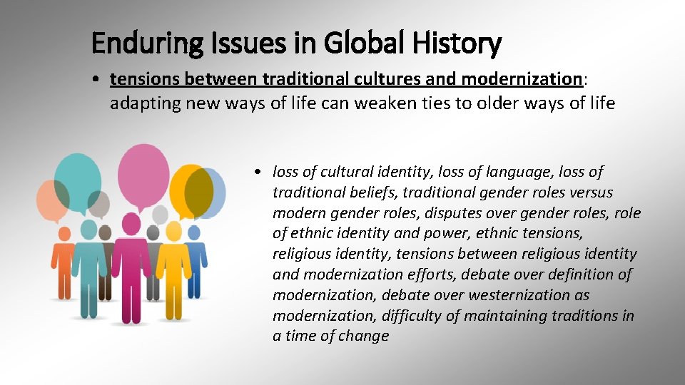 Enduring Issues in Global History • tensions between traditional cultures and modernization: adapting new ways of life can weaken ties to older ways of life • loss of cultural identity, loss of language, loss of traditional beliefs, traditional gender roles versus modern gender roles, disputes over gender roles, role of ethnic identity and power, ethnic tensions, religious identity, tensions between religious identity and modernization efforts, debate over definition of modernization, debate over westernization as modernization, difficulty of maintaining traditions in a time of change