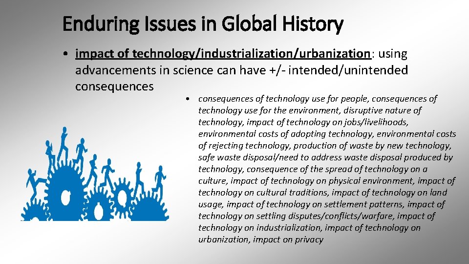 Enduring Issues in Global History • impact of technology/industrialization/urbanization: using advancements in science can have +/- intended/unintended consequences • consequences of technology use for people, consequences of technology use for the environment, disruptive nature of technology, impact of technology on jobs/livelihoods, environmental costs of adopting technology, environmental costs of rejecting technology, production of waste by new technology, safe waste disposal/need to address waste disposal produced by technology, consequence of the spread of technology on a culture, impact of technology on physical environment, impact of technology on cultural traditions, impact of technology on land usage, impact of technology on settlement patterns, impact of technology on settling disputes/conflicts/warfare, impact of technology on industrialization, impact of technology on urbanization, impact on privacy