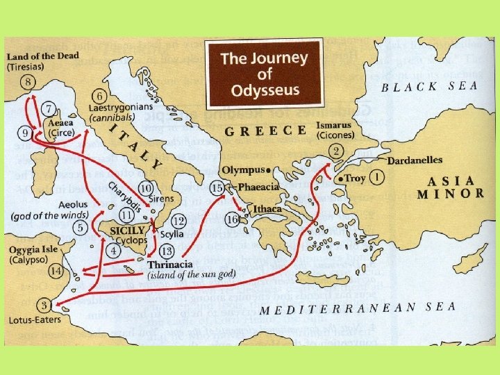 Timeline of Events: 1. Troy 2. Cicones 3. Lotus Eaters 4. Cyclopes 5. Aeolus and back 6. Laestrygonians 7. Circe 8. Tiresias, the Underworld, Hades 9. Back to Circe 10. The Sirens 11. Scylla and Charybdis 12. Thrinacia, Helios’ Cattle 13. Calypso 14. Phaecians, Nausicaa 15. Ithaca