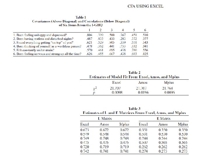 Confirmatory Factor Analysis (ML): STATA estat fitindices commands Fit indices RMSEA = 0. 2276 0. 2703) RMSR = 0. 0724 90% CI= (0. 1868, TLI CFI = 0. 7702 = 0. 2967 AIC BIC = = 946. 633 986. 087