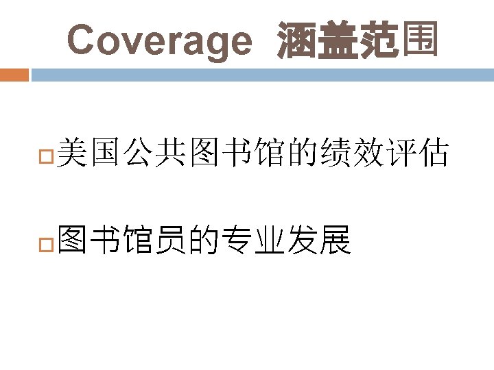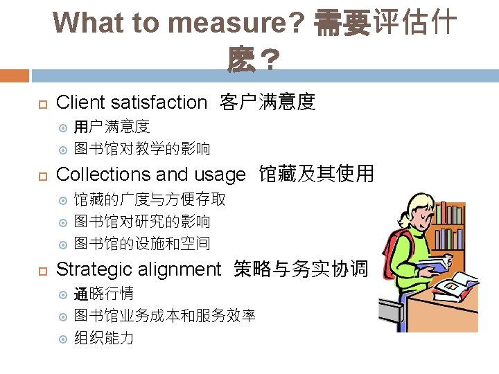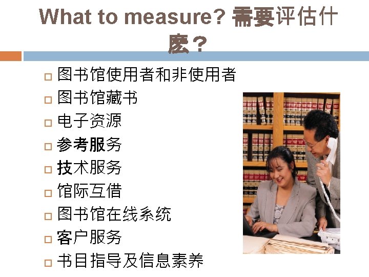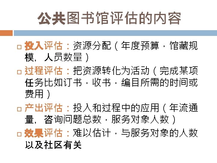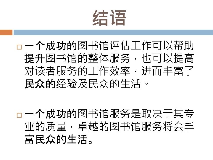 Libraries enrich lives 图书馆丰富 生活 Library assessment is an integral part of successful library management. It is a means and process that “libraries of all kinds are looking more closely at how and how well they are serving their users. ” 图书馆的绩效评估是成功的图书馆管理的 重要组成部分。它是一种方法也是一个过 程,它是“所有各种图书馆更积极找寻如何 有效的为图书馆用户提供服务”的方法。 Wright and White (2007). Library Assessment. Series: SPEC kit, 303. p. 11.