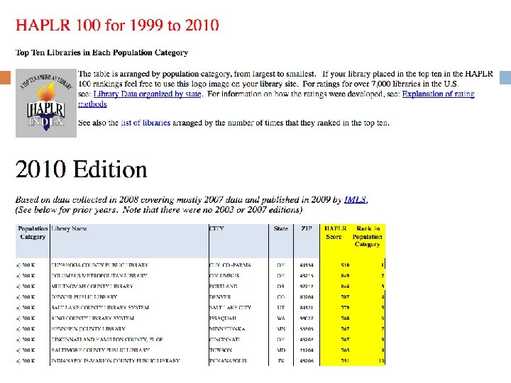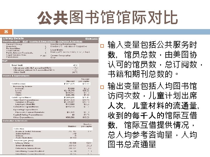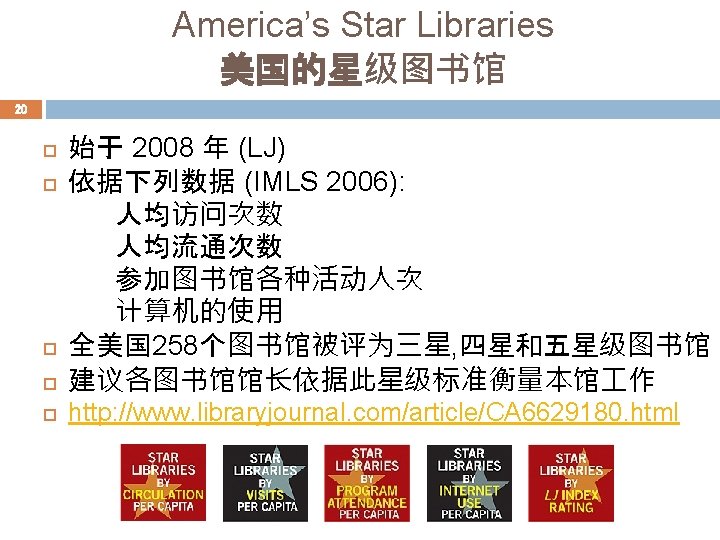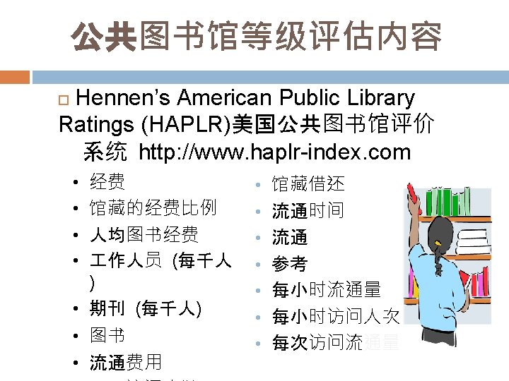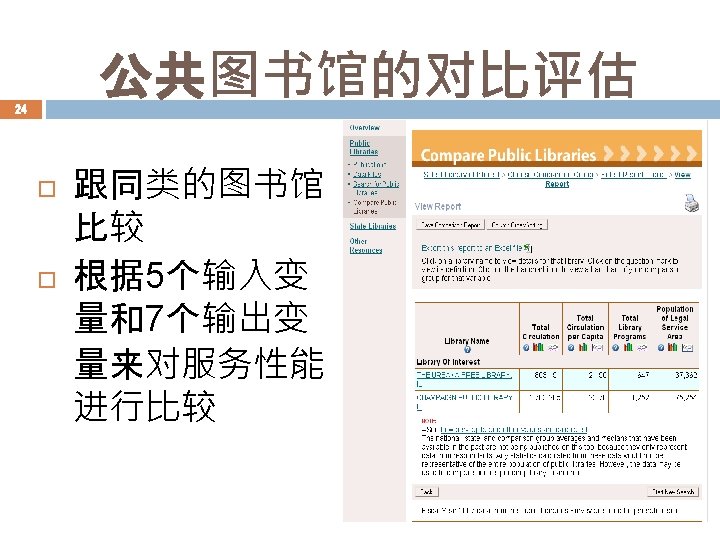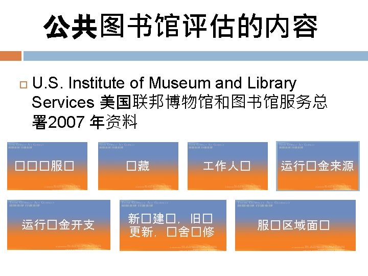 公共图书馆服务评估的方法和 具 Public Library Data Service Statistical Report http: //www. ala. org/ala/mgrps/divs/plap ublications/pldsstatreport/ 公共图书馆数据服务 统计报告