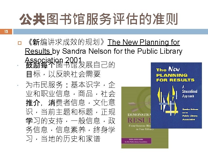 公共图书馆服务评估的准则 The Public Library Service: IFLA/UNESCO Guidelines for Development 2001 公共图书馆服务:国 际图联/联合国科教文 组织发展准则