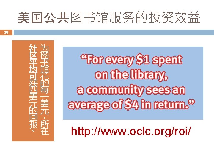 美国公共图书馆服务的投资效益 30 如何计算 经济效益 (个人) How to Calculate the Return on Investmen t (ROI) http: //www. lrs. org/public/roi/usercalculator. php
