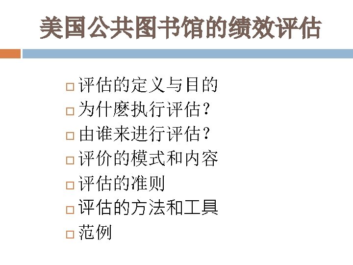 Public Library Assessment 公共图书馆的绩效评估 图书馆服务的绩效评价可以帮助我们在管理 中,能够有足够的数据、事实、调查和分 析来帮助我们做出明智的决定,从而最大 限度地发挥图书馆资源和服务的效益。 “Decisions are based on facts, research, and analysis, and where services are planned and delivered in ways that maximize positive outcomes and impacts for customers and stakeholders. ”