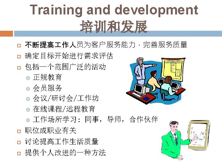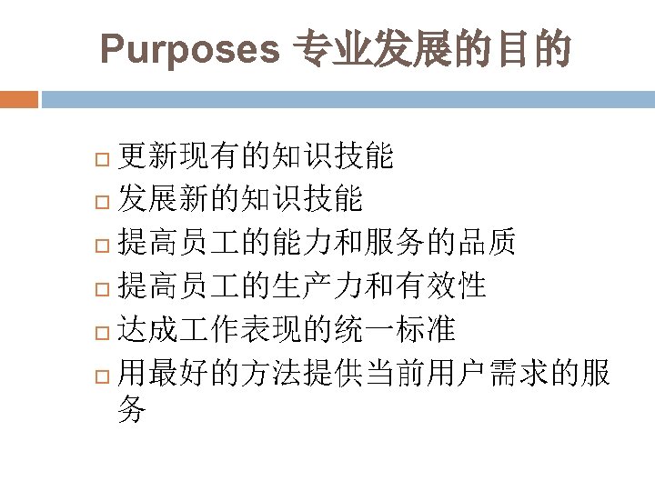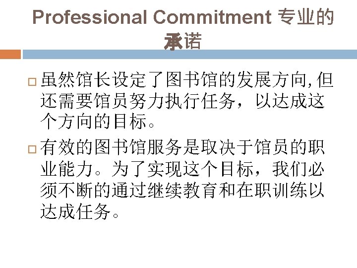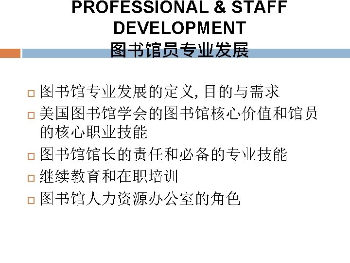 Definition 图书馆专业发展的定义 专业人员和职员的发展是一个持续不断的过程。 它透过一个系统的方法,为每一个图书馆的成 员提供培训,使他们熟悉并提升 作能力,以 期大家共同努力为客户提供服务。 这是一个 持续专业教育比较侧重的形式。 Professional and staff development is the ongoing process that orients, trains, and develops, through a systematic approach, each member of a library organization to work together to serve its customers. It is a more focused form of continuing professional education.