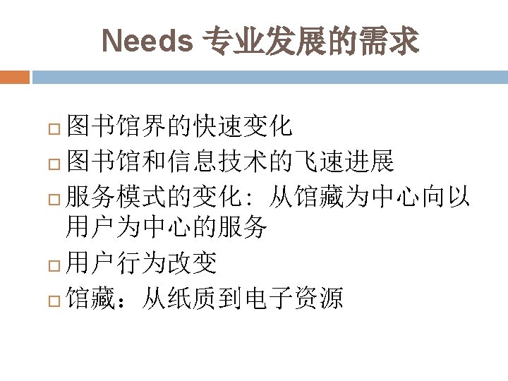 ALA’s Core Values of Librarianship 图书馆的核心价值 • Access http: //www. ala. org/ala/aboutala/offices/oif/statem entspols/corevaluesstatement/corevalues. cfm Confidentiality Access /Privacy �私� 获取 Education & Lifelong Learning 教育与终身学习 Intellectual Freedom 知识自由 Professionalism Service 职业理念 服务 Democracy 民主 Diversity 多元化 Preservation 保存 The Public Good 公众利益 Social Responsibility 社会责任