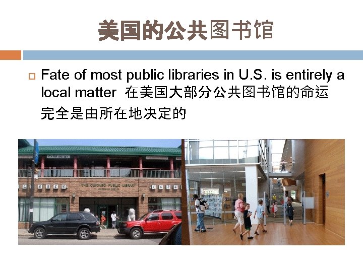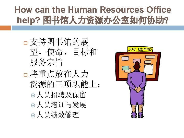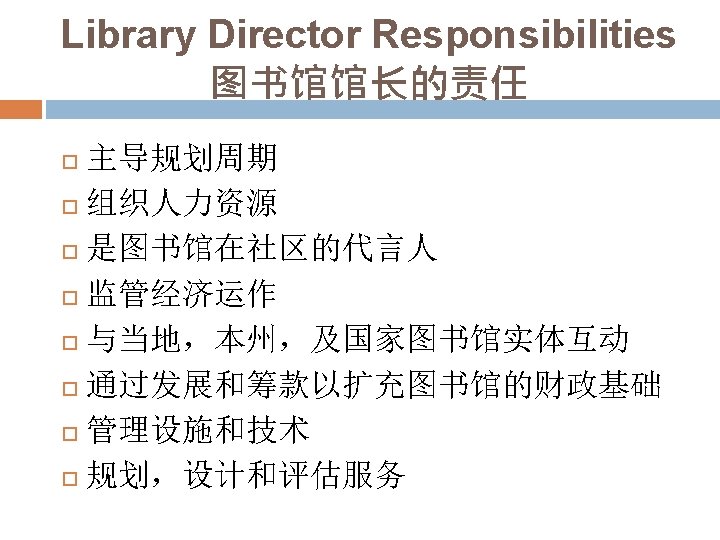 Library Director Responsibilities 图书馆馆长的责任 “The library director works closely with the library board to realize the public library mission, develop long range plans, and implement policies for the library’s operations. The director works at the nexus of community and staff. Directors are expected to handle numerous responsibilities. ” 图书馆馆长与图书馆委员会紧密合作,以实现公共图 书馆的使命,发展长期规划,并执行图书馆的业务的 各项政策。 加强社区和 作人员之间的联系。 *Mc. Cook (2004). Introduction to Public Librarianship, p. 141