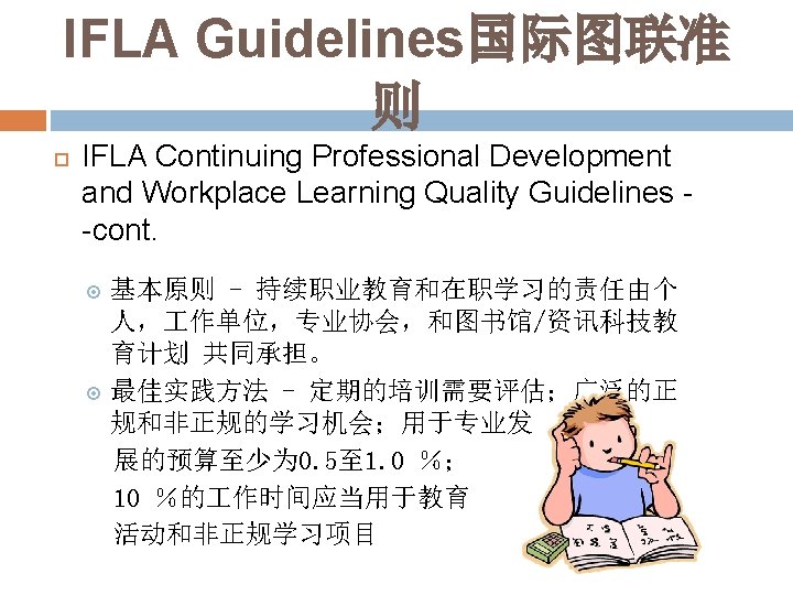 Professional development guidelines 专业发展的准则 IFLA Continuing Professional Development and Workplace Learning Quality Guidelines http: //www. ifla. org/en/publications/cpdwl -quality-guidelines-project 专业知识的成长,必须仰赖资讯 作者 持续扩充他们的知识和技能 *IFLA/UNESCO Public Library Manifesto 1994 国际图联和联合国文教组织1994年发表的公共图书馆宣言