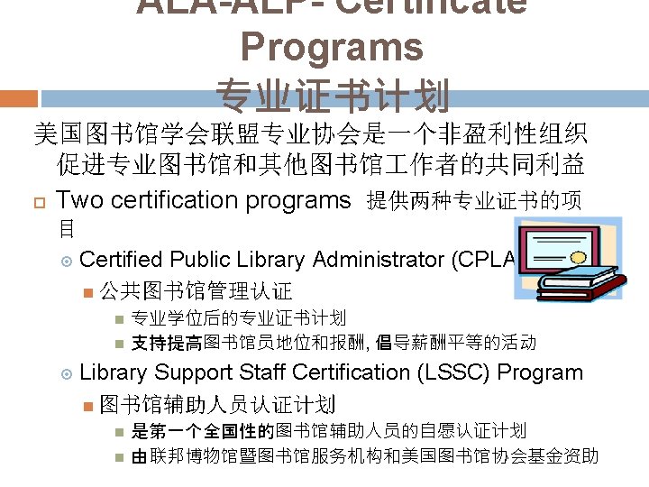 ALA-ALP Certified Public Library Administrator (CPLA) 公共图书馆管理认证 CORE (required) 必修 ELECTIVES (3 of 5 required) 选修 当前的问题 筹款/基金申请 营销 政治与建立关系网络 服务不同的群体 http: //www. lis. illinois. edu/academics/programs/cpd/cpla 预算和财务 技术管理 组织和人事管理 建筑的规划与管理