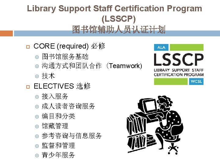 ALA’s Core Competencies of Librarianship 图书馆员应具备的核心 职业能力 Foundations of the profession Information resources Organization of recorded knowledge and information Technological knowledge and skills Reference and user services Research Administration and management Continuing education & 专业基础 信息资源 组织有记录的知识与信息 技术知识与技能 参考与用户服务 研究 行政和管理 继续教育与终身学习