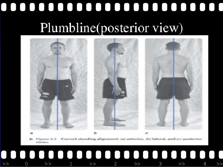 Standard Posture A plumb line is used to determine whether the points of reference of the body are in the same alignment as standard posture. The amount of deviation of the various point of reference from the plumb line reveal the extend of body malalignment. The amount of deviation from plumb line are described as slight , moderate , sever (marked).