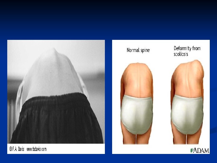 Scoliosis Posture in Scoliosis n n n Shoulders not level, prominent or uneven scapulas Uneven gap between arm and body Elevated or uneven hip Head not centered Bending test reveals uneven portions of back