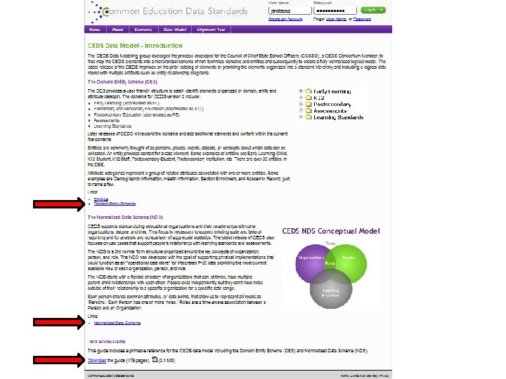 CEDS Logical Data Model Comprised of 2 distinct views: views • Domain Entity Schema (DES) • A hierarchy of domains, entities, attribute categories, and • attributes organizing and assigning elements to specific entities Used primarily by people as an index to search, map, and organize elements • Normalized Data Schema (NDS) • The NDS Logical Model provides a standard framework for integration of P-20 data systems through a well-normalized “operational data store” • NDS factors the entities and attributes of the DES with standard technical syntax and 3 rd normal form