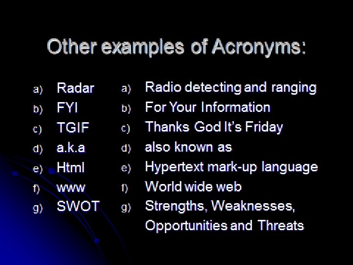 Acronymy is the process whereby a new word is formed from the initial letters of the constituent words of a phrase or a sentence. For example, from the initial letters of the words of the phrase North Atlantic Treaty Organization, the word NATO is formed. The words created by this process are called acronyms; all of them function as nouns.
