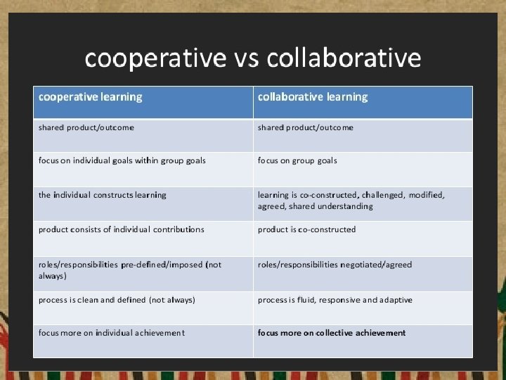 COLLABORATIVE LEARNING In contrast to collaborative learning, a cooperative learning structure takes the following form: - Activities are structured with each student assigned a specific role (teacher-structured) - Teachers supply information for students to read analyse (or let pupils know where this info can be found)