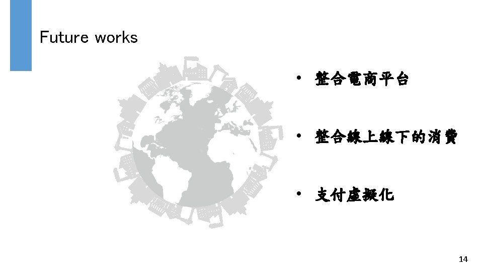 Pay Process Coupon contract Pay coupon Consumer’s public key Coupon contract addr. Consumer Owner(consumer public key) Use date Use value Coupon contract Owner(consumer public key) Use date Use value status(used) Merchant Etherum 13