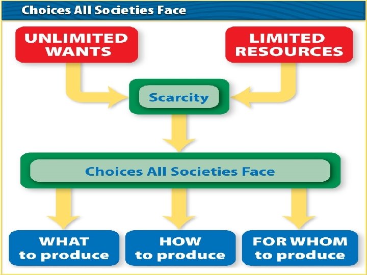 The Problem of Scarcity (cont. ) �Countries have to make choices: • What to produce? • How to produce? • For whom to produce?