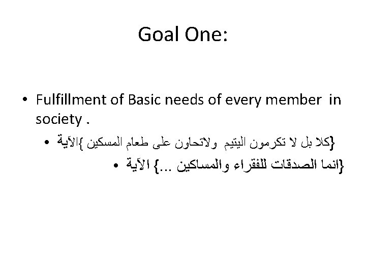 Goal Two Reduction of inequality • Reduction of Income and wealth inequality. 59: 8 • }ﻛﻴﻼ ﻳﻜﻮﻥ ﺩﻭﻟﺔ ﺑﻴﻦ ﺍﻷﻐﻨﻴﺎﺀ ﻣﻨﻜﻢ { ﺍﻵﻴﺔ • {. . so that it [wealth] may not merely circulate between the rich among you } 59: 8 • As far as I know, Islam is the only religion whose Holy Book explicitly states such goal.