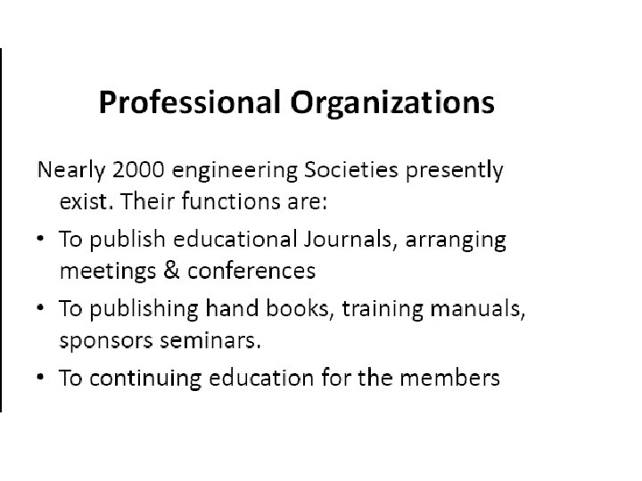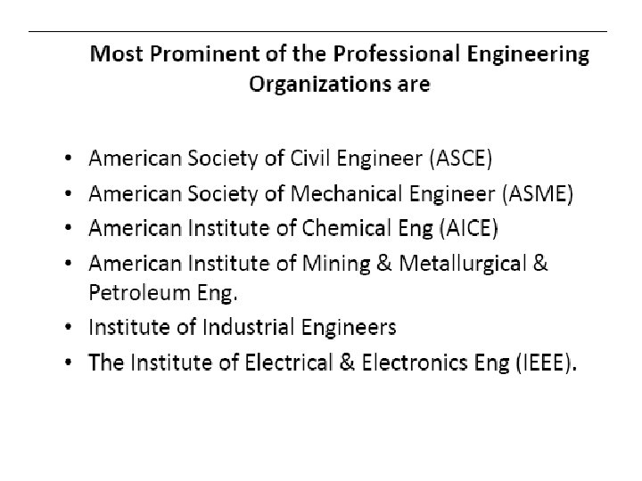 Engineering Organizations 1. Accreditation Board of Engineering: Examines the credentials of the engineering program’s faculty, curricular content, facilities, and admission standards before granting accreditation. 2. Engineering Association: Most engineering degrees are granted in civil, electrical, mechanical, chemical and architectural engineering. 3. Professional Engineering organization: