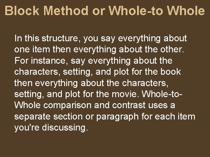 Block Method or Whole-to Whole In this structure, you say everything about one item then everything about the other. For instance, say everything about the characters, setting, and plot for the book then everything about the characters, setting, and plot for the movie. Whole-to. Whole comparison and contrast uses a separate section or paragraph for each item you're discussing.
