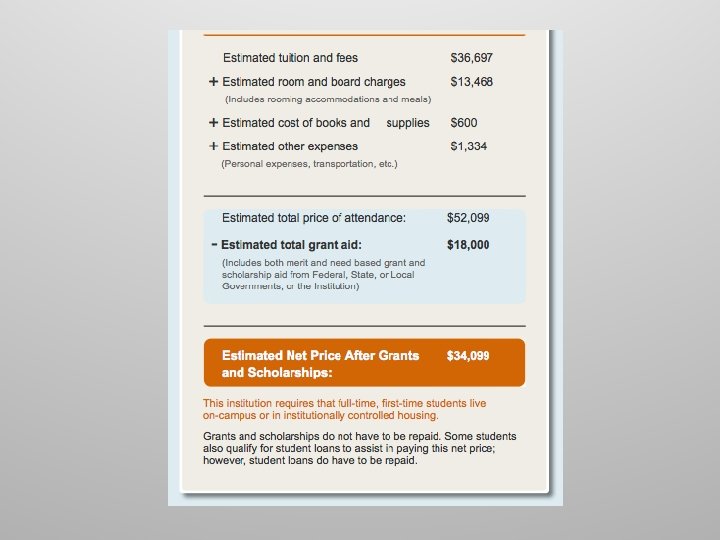 College A Sample Aid Letter Cost: Tuition: $6, 500 Fees: $1, 200 Room: $5, 200 Board: $4, 000 Books & Supplies: $1, 800 Travel & Misc. : $1, 300 ___________ Financial Aid: College A Scholarship: $9, 500 Pell Grant: $1, 250 State Grant: $1, 250 Total Cost of Attendance: $20, 000 Total Aid: $12, 000 _____________