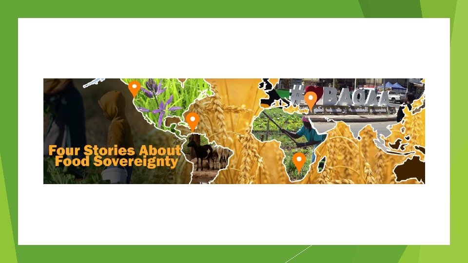 What is “food sovereignty”? “The right of peoples to healthy and culturally appropriate food produced through ecologically sound and sustainable methods, and their right to define their own food and agriculture systems” Source: La Via Campesina