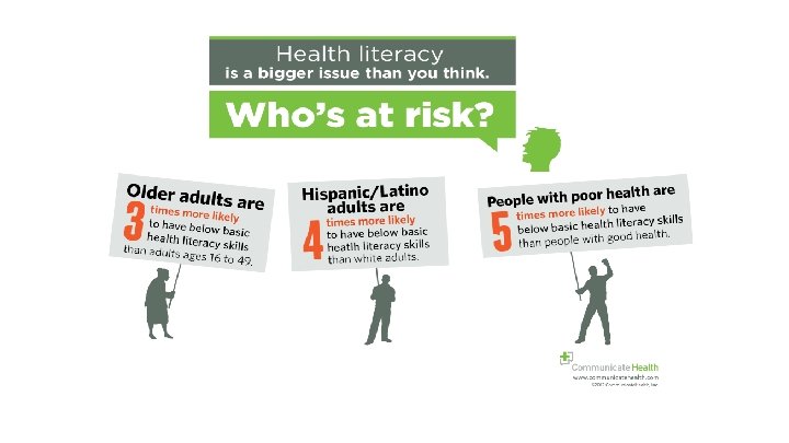 Importance of Health Literacy Environment 5% Access to Medical Care 10% Greatest impact of health literacy Social and Economic 30% Behavior Choices 35% (e. g. , diet, exercise, unprotected sex) Genetics 20%