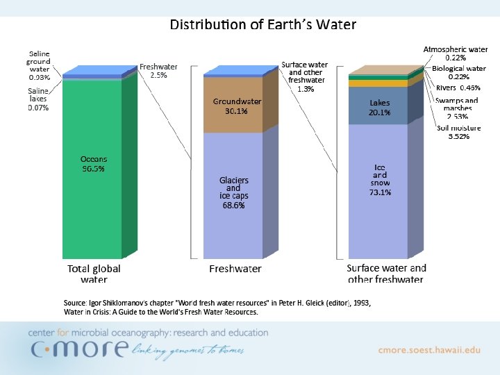 Distribution of Water on Earth • 96. 5% in the ocean • 321, 000 cubic miles • 2. 5% freshwater • 73. 1% ice and snow • Only a small fraction available for use • 46, 000 cubic miles