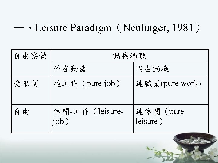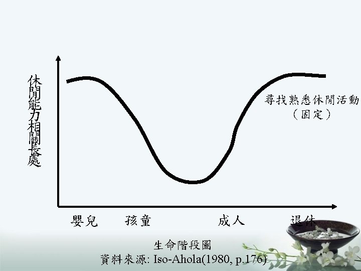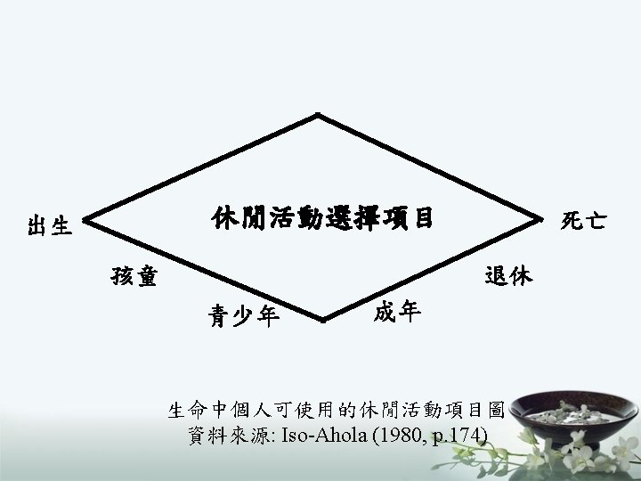 休閒遊憩西方社會歷史 所扮演之角色 500 B. C. 1350 A. D. 1500 1800 Golden Age Education of Leisure Dark Age Work or Leisure 1920 s Buy your Leisure Today Life is Leisure