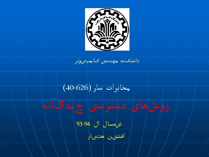 Multiple Access Techniques (2) v FDMA o Example: old AMPS systems with analog 30 KHz channels. v TDMA o One of important issues is synchronization o Special pattern in each frame used to correlate and synchronize named Preamble o Overhead such as guard bits between frames and coding bits should be taken into account to compute throughput. o Example: for GSM each time slot consists of 6 trailing bits, 26 training bits, 116 information bits, and equals to 8. 25 bits guard time so: b. T = 8*(6+8. 25+26+116) = 1250 bits b. OH = 8*(6+8. 25+26) = 322 bits Efficiency = (1 -b. OH/b. T)*100% = 74%