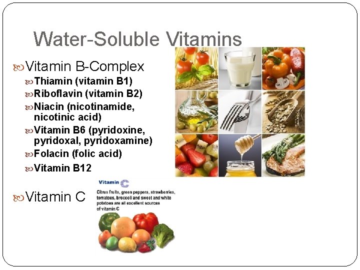 Water-Soluble Vitamins Vitamin B-Complex Thiamin (vitamin B 1) Riboflavin (vitamin B 2) Niacin (nicotinamide, nicotinic acid) Vitamin B 6 (pyridoxine, pyridoxal, pyridoxamine) Folacin (folic acid) Vitamin B 12 Vitamin C